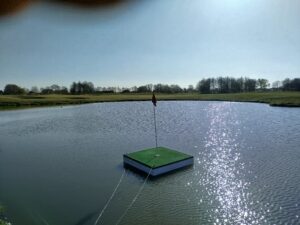 Op de open dag hebben we een Drijvende Hole in de grote waterpartij bij onze Brasserie.